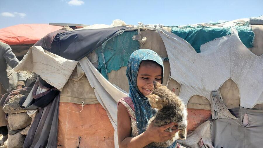 Une fillette yéménite joue avec un chaton dans un site accueillant des personnes déplacées à Sanaa, au Yémen, en novembre 2021.