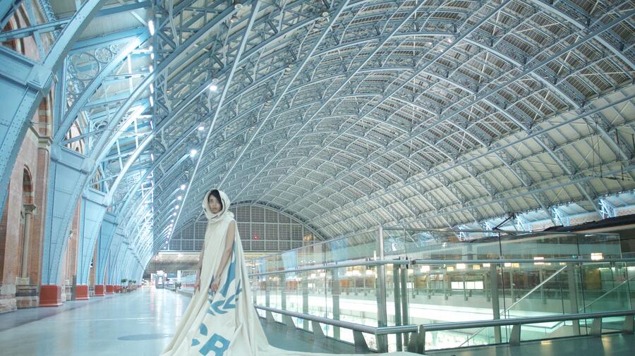 LONDRES, le 30 novembre (UNHCR) - Une robe faite à partir du lourd tissu d'une tente utilisée par les réfugiés en Jordanie revient à la vie de façon inattendue à la gare ferroviaire de Londres, où elle arbore des données météorologiques fournies par le Met Office.