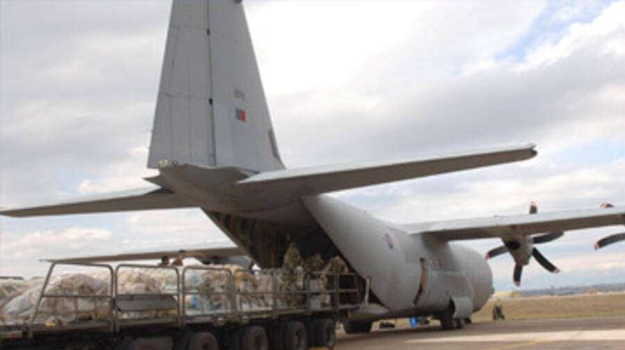 Des palettes de tentes et de couvertures sont chargées à bord d'un avion britannique de l'OTAN sur la base aérienne d'Incirlik en Turquie.