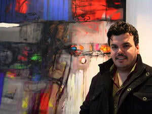 L'artiste Victor Ochoa guide un visiteur dans une exposition d'art à Madrid.