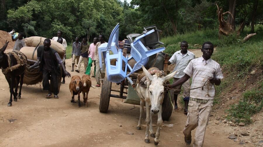 Prévoient-ils un exil prolongé ? Des réfugiés de l'Etat du Nil Bleu traversent la frontière vers l'ouest de l'Ethiopie avec des effets personnels nécessaires pour un exil prolongé.