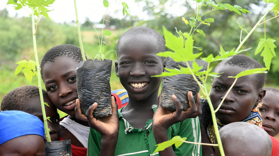 Lydia porte son attention sur une douzaine d'autres enfants qui sont venus chercher des arbres fruitiers, des acacias ou des moringas à planter autour de leurs maisons. À terme, ils fourniront des fruits, des remèdes médicinaux et bien plus encore.