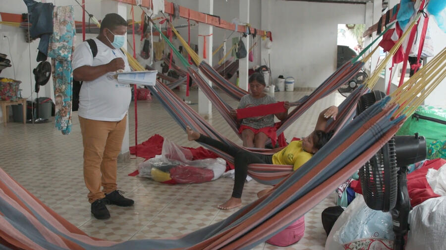 Marcelino sillonne les lieux de refuge pour leur communauté dans la ville de Manaus, discute avec les résidents et les nouveaux arrivants pour comprendre leurs besoins médicaux et nutritionnels et les aider à obtenir toute l’aide dont ils pourraient avoir besoin.