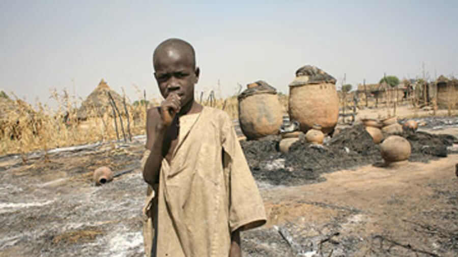 Un jeune garçon devant ce qui reste du village de Djorlo, attaqué et incendié par des hommes armés à cheval.
