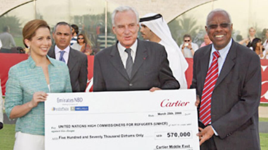 La Princesse Haya Bint Al Hussein, épouse du Premier Ministre des Emirats arabes unis (EAU) Sheikh Mohammed Bin Rashid Al Maktoum, et Bernard Fornas, Président de Cartier International, ont remis un chèque au délégué régional de l'UNHCR Ahmed Gurbartalla vendredi dernier durant le Polo Challenge Cartier International 2008 de Dubaï.