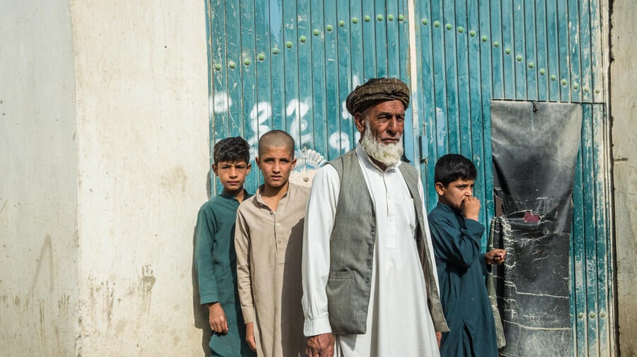 Des Afghans dans les rues de Tarakhil Dag, un village de la banlieue de Kaboul qui héberge un grand nombre de personnes rentrées en Afghanistan après avoir passé des décennies comme réfugiés au Pakistan, ainsi que des déplacés internes originaires du nord et de l'est du pays, chassés de leurs foyers par la violence et l'insécurité.