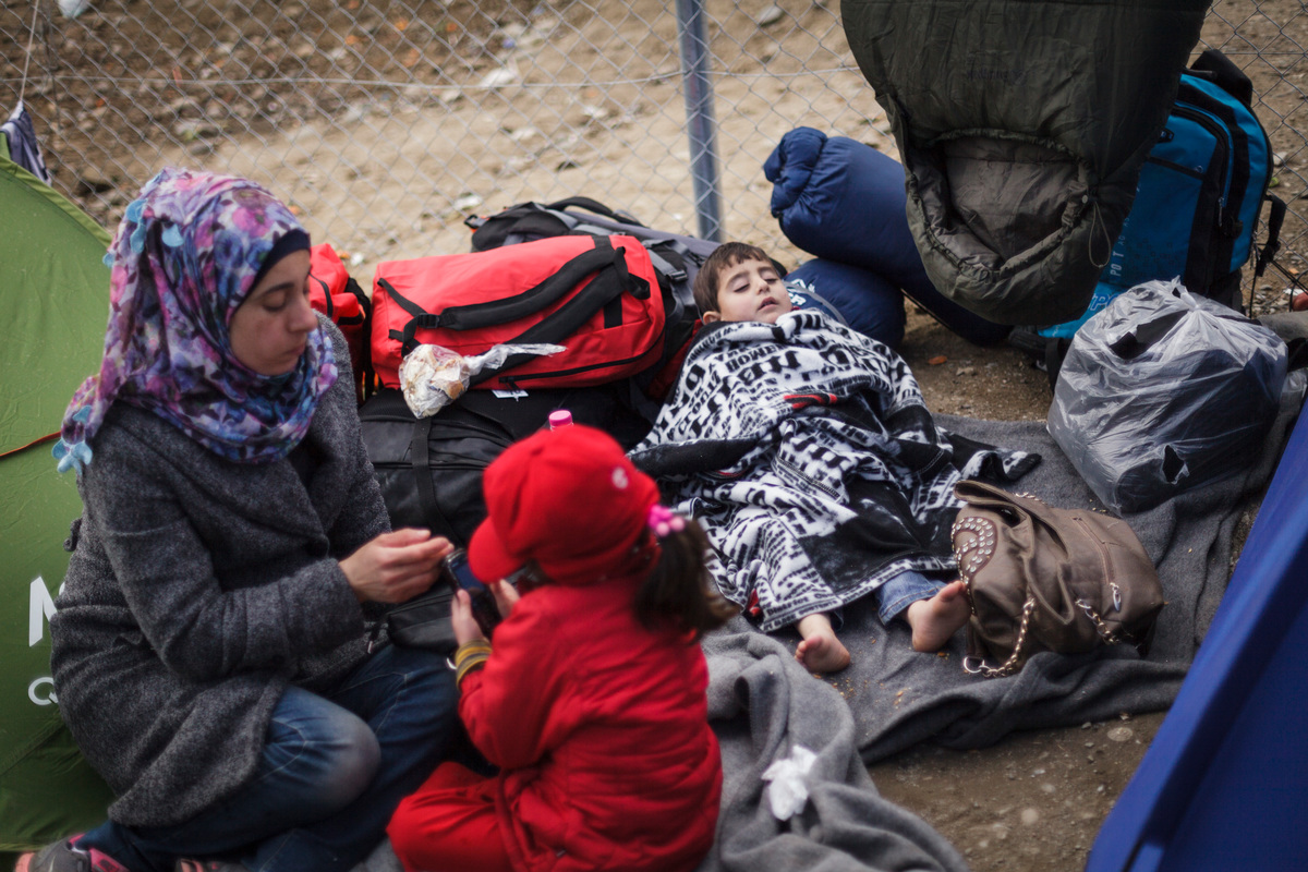 Une réfugiée syrienne attend avec ses enfants de pouvoir traverser la frontière depuis la Grèce vers l'ex-République yougoslave de Macédoine.