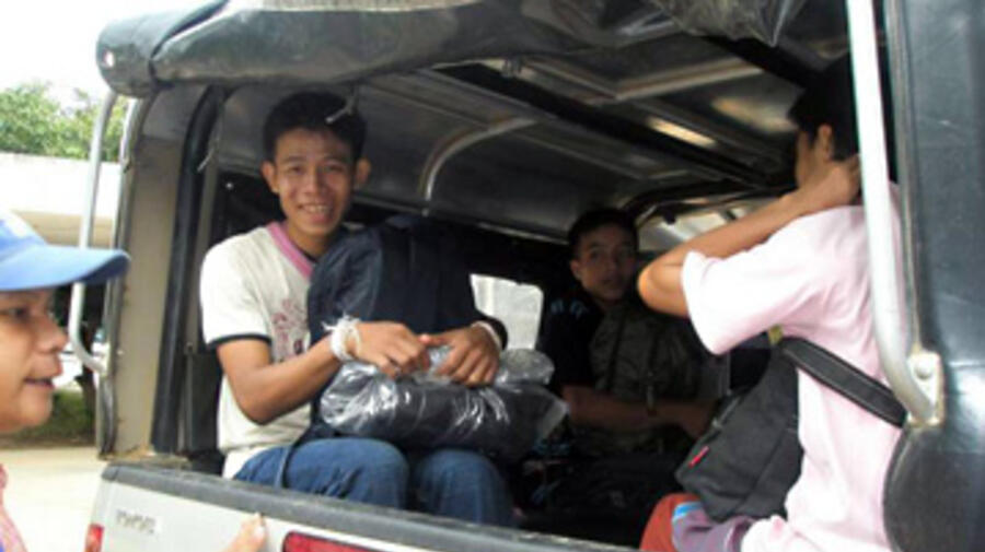 Plu Reh se dirige vers l'arrêt de bus, première étape de son périple d'abord à Bangkok puis par avion jusqu'aux Etats-Unis.