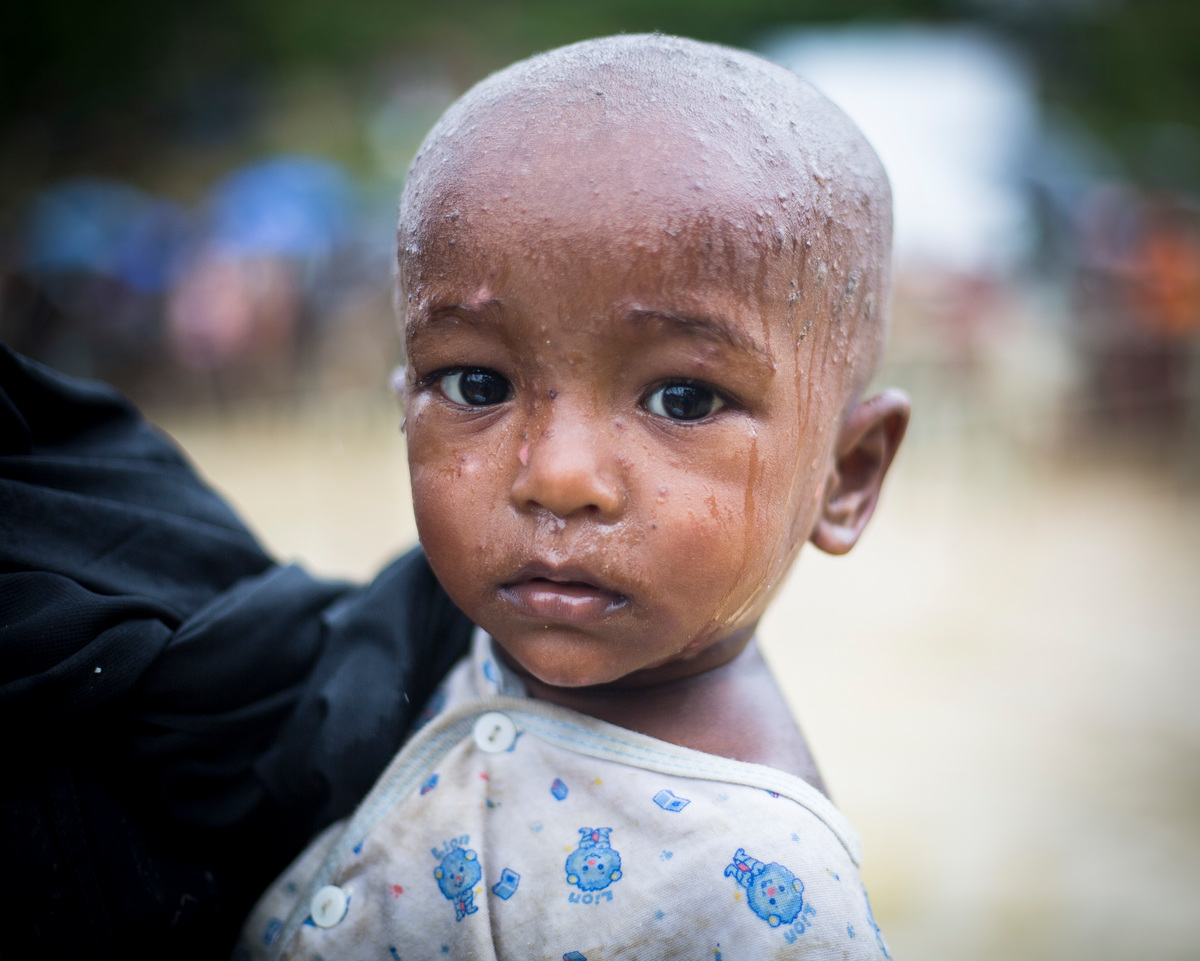 Un bébé rohingya et sa mère font la queue sous la pluie lors d'une distribution d'aide dans le camp de réfugiés de Kutupalong, près de Cox's Bazar, au Bangladesh.