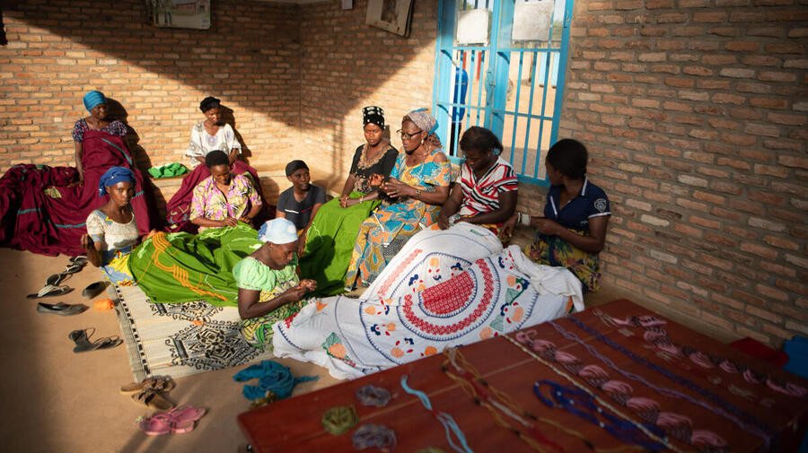 Des femmes congolaises vivant dans le camp de réfugiés de Nayakanda au Burundi brodent des tissus, qu'elles vendent et dont elles partagent les bénéfices.