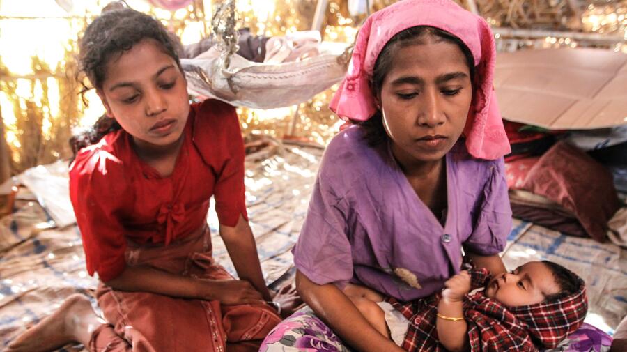 Une mère déplacée et ses deux enfants dans l'Etat de Rakhine. Ils sont originaires de la région de Pauktaw, où est survenu le violent incident de jeudi.