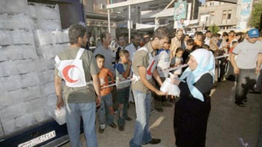 Les volontaires du Croissant-Rouge arabe syrien distribuent des repas, le premier jour du ramadan.