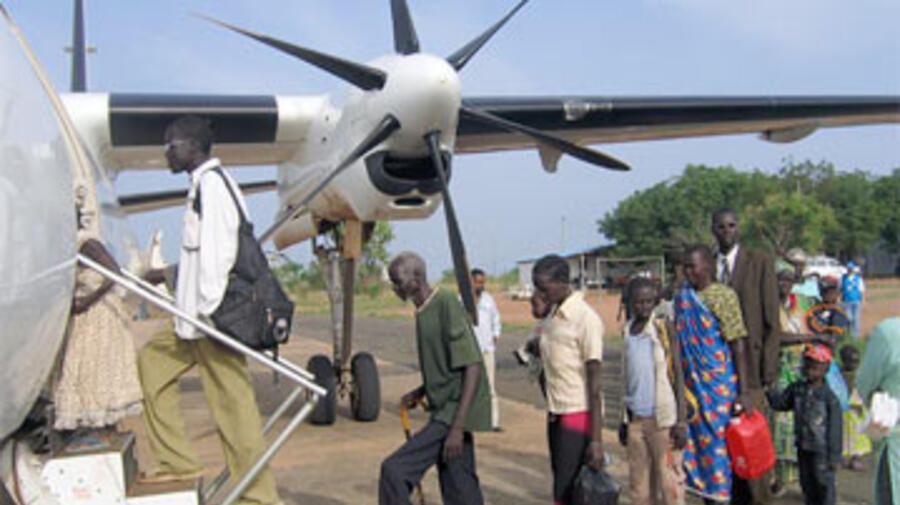 Des réfugiés soudanais embarquent dans l'avion qui les ramènera dans leur pays natal depuis l'Ethiopie. L'UNHCR a aidé plus de 100 000 réfugiés au retour vers le Sud-Soudan par voies aérienne et terrestre.