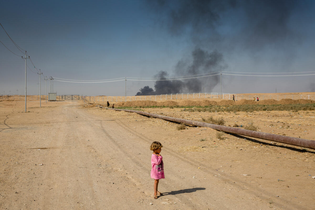 Une enfant déplacée se tient à la périphérie du camp de Debaga dans la Région du Kurdistan d'Iraq. Le camp est situé à seulement 40 kilomètres de la ligne de front dans le cadre de l'offensive militaire pour reprendre Mossoul