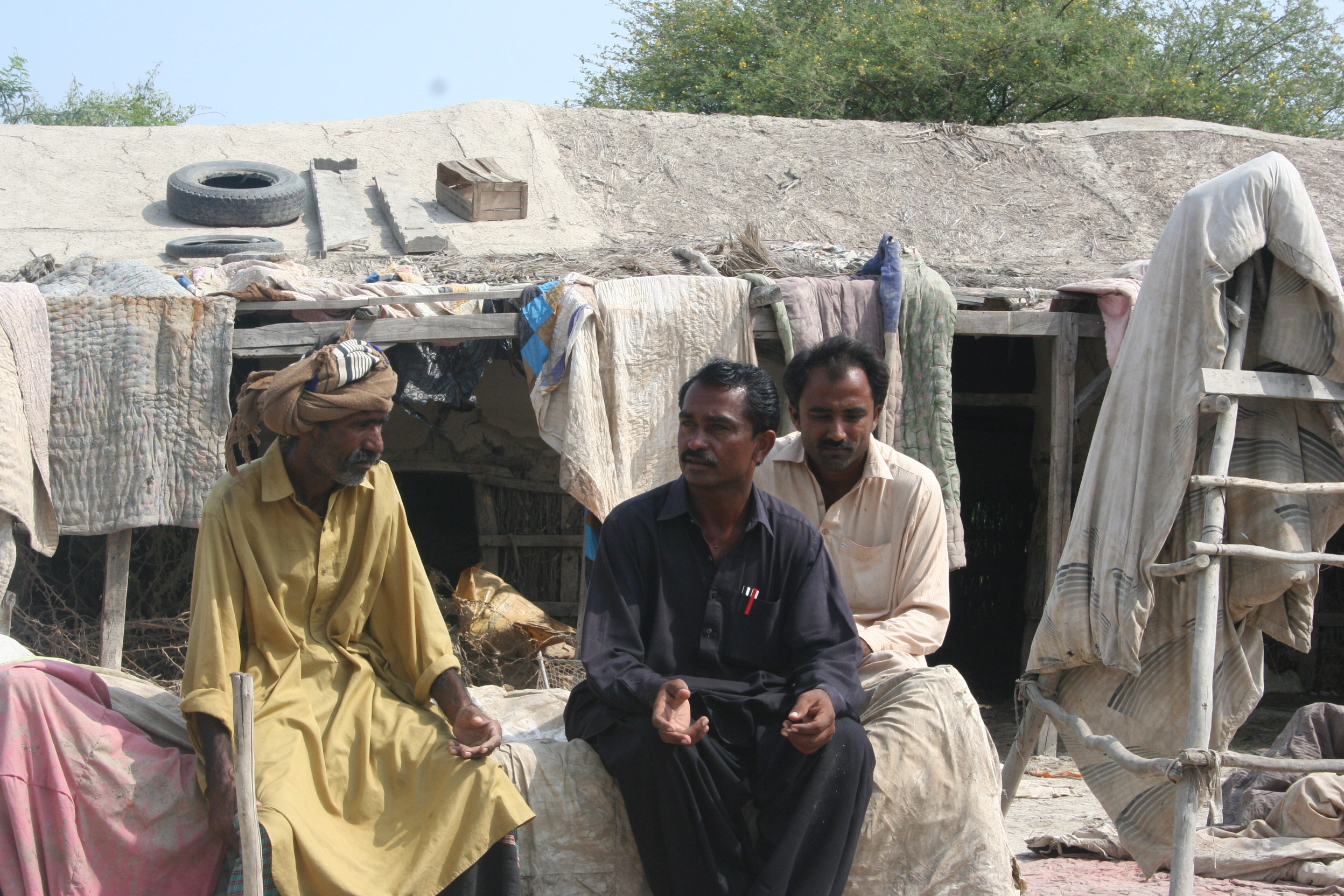 Mohammad Achar, au centre, discute avec des proches de la destruction de sa maison durant les inondations au Pakistan.
