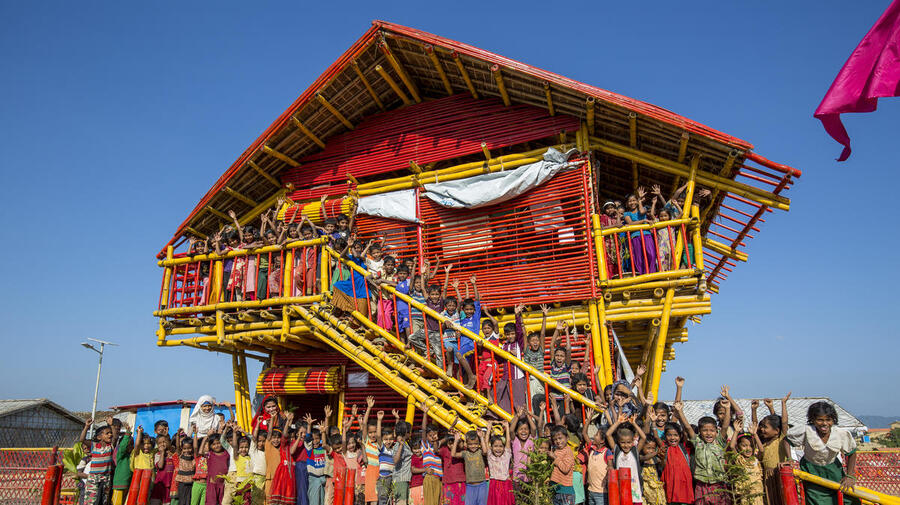 L’enseignement primaire élémentaire est dispensé à ses trois plus jeunes enfants au centre d'apprentissage temporaire Sunflower situé à quelques pas de l'abri familial. Peint en rouge et jaune, le centre est soutenu par le HCR, l'Agence des Nations Unies pour les réfugiés, et géré par son partenaire bangladais BRAC.