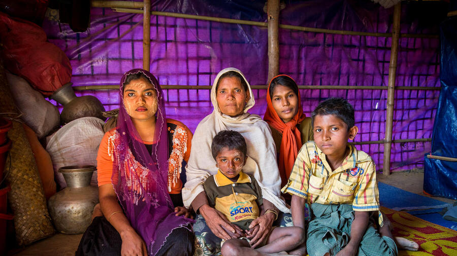 Sufia Khatun (habillée en blanc) est entourée de certains membres de sa famille dans leur abri du camp de Kutupalong, au Bangladesh. De gauche à droite : Nur Begum (20 ans) et le fils de celle-ci, Mohammad Hossen (3 ans et demi) ; Fatema Khatun (12 ans) et Omar Faruq (8 ans).