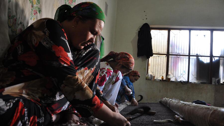 Khadija, une réfugiée turkmène originaire d'Afghanistan, tisse un tapis au côté de sa soeur et de sa belle-mère. En moyenne, la famille produit deux tapis par mois.