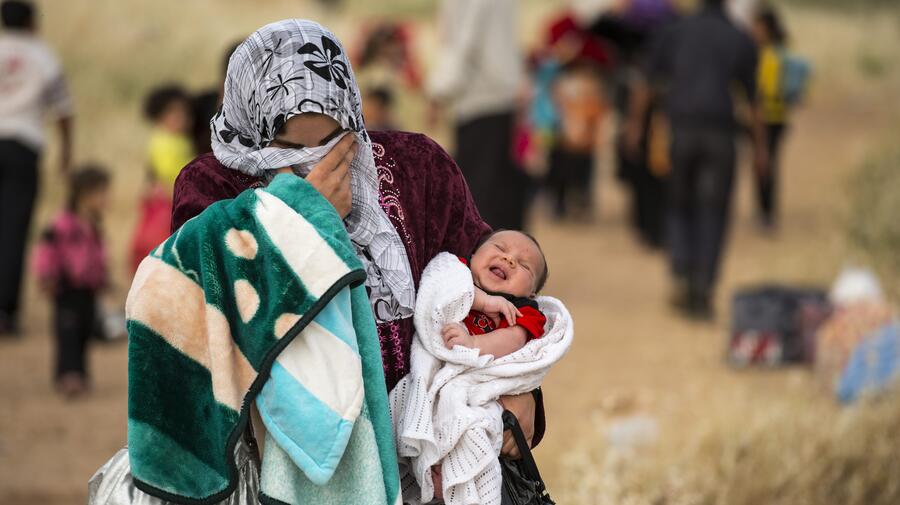 Une jeune mère syrienne traverse la frontière vers la Jordanie avec son fils âgé d'un mois. Les enfants syriens nés en exils sont particulièrement vulnérables au risque d'apatridie.