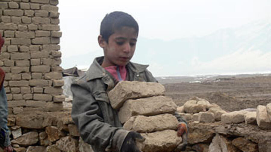 Hamid, âgé de six ans, aide son père, Jan Agha, à construire leur maison avec le matériel de l'UNHCR dans le village de Churchurak, au nord de l'Afghanistan.
