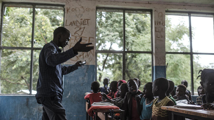 Cet enseignant de 41 ans et ses élèves, installés à ses pieds, récitent en tapant des mains l'alphabet en nuer, leur langue maternelle, suivi de quelques phrases entonnées en anglais avec enthousiasme. Il est convaincu que les enfants apprennent mieux quand leurs leçons sont vivantes et ludiques.