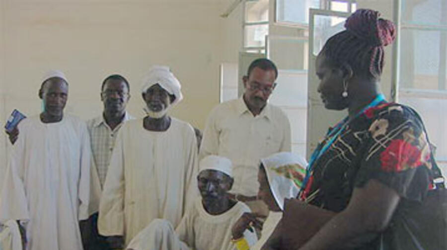 Dans un hôpital de Khartoum, Mohamed Ahmed Jamil Musa discute avec son frère Adam (debout, en turban) et le personnel de l'UNHCR qui a aidé à les réunir.