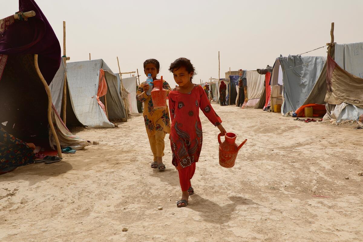 Les filles de Maryam retournent à leur abri après avoir collecté de l'eau dans le camp de Nawabad Farabi-ha.