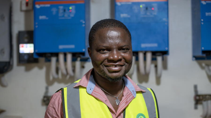Vasco Hamisi est à pied d'œuvre pour vérifier les panneaux solaires installés par Okapi Green Energy Limited, dans le camp de réfugiés de Kakuma, au nord-ouest du Kenya. Ce réfugié congolais est le créateur de cette structure, qui fournit une énergie propre à 200 commerces à l'intérieur et à l'extérieur du camp, ainsi qu'à de nombreux foyers de réfugiés.
