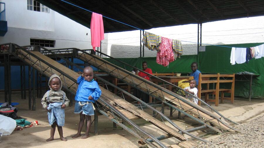 De jeunes réfugiés rwandais observent des visiteurs dans l'est du Congo. Le HCR travaille au retour des réfugiés restants.