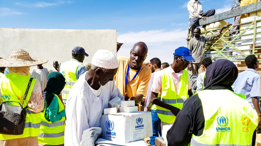 Un homme reçoit des fournitures du HCR (des bâches en plastique, une couverture, une boîte et du savon) de la part d'employés vêtus de vestes du HCR.
