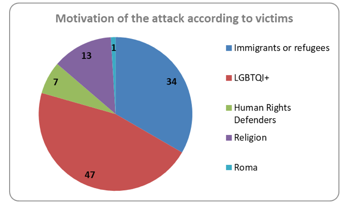 In 47 incidents, the victims were LGBTQI people. In 11 incidents, sacred or symbolic places and the Jewish community were targeted, whereas in two incidents, the victims were Greek citizens, targeted on grounds of their religious beliefs. In one incident, the victim was a male member of the Roma community. In 37 incidents, more than one victim was targeted, whereas in 55 incidents the assault was committed by two or more people.