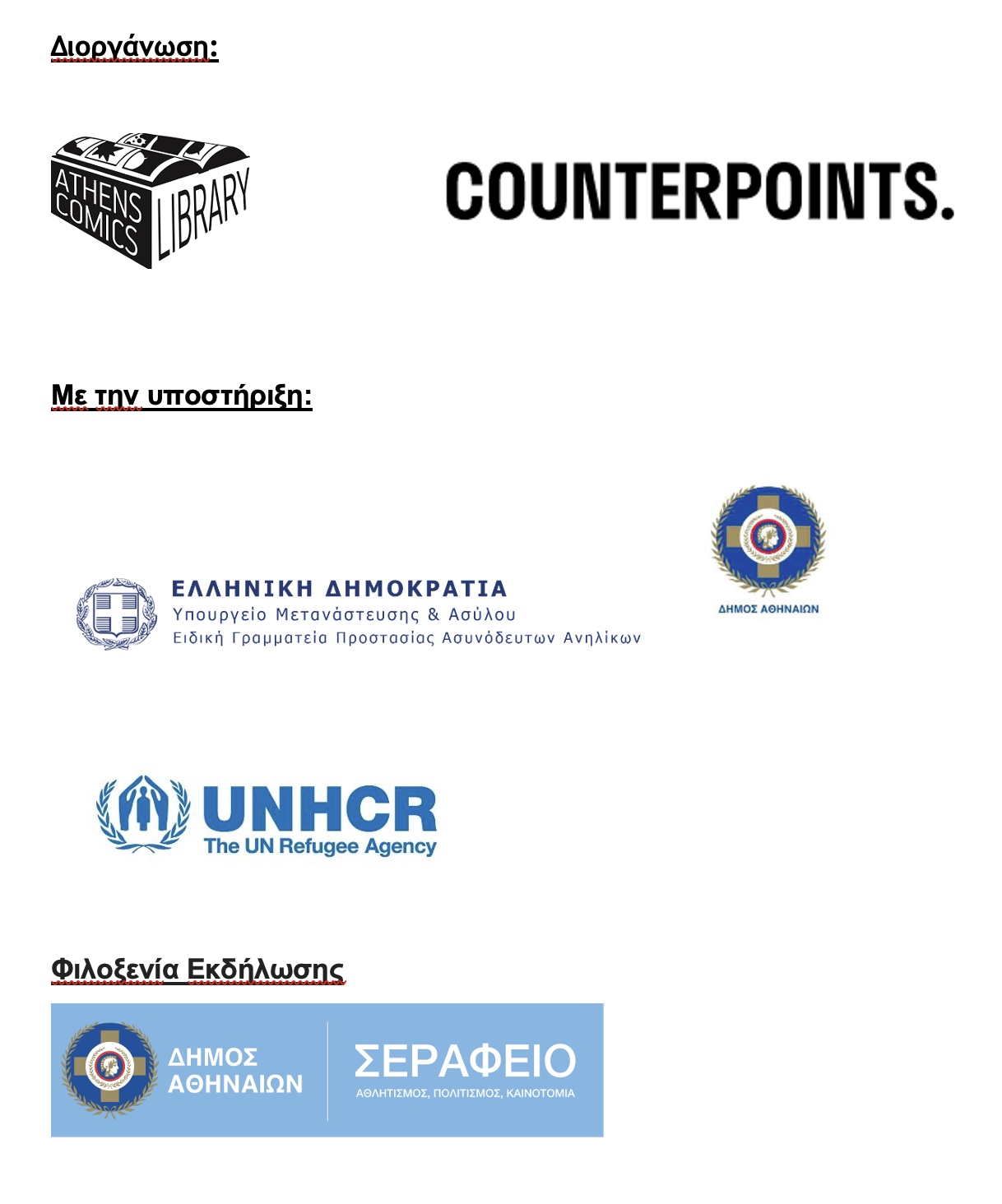 Το Refugee Week Greece πραγματοποιείται με τη στήριξη του Δήμου Αθηναίων, της Ειδικής Γραμματείας Προστασίας Ασυνόδευτων Ανηλίκων του Υπουργείου Μετανάστευσης και Ασύλου και της Ύπατης Αρμοστείας του ΟΗΕ για τους Πρόσφυγες.