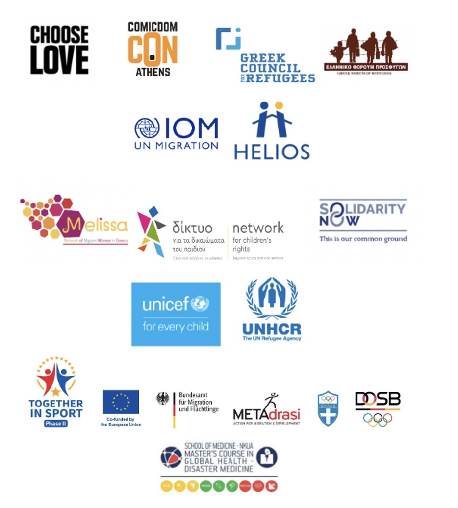 Amurtel Hellas | Athens PhotoWalkers | Caritas Αθήνα | Choose Love | Comicdom | Counterpoints Arts Greece | Diversity United | FreeMovement Skateboarding | GCR - Ελληνικό Συμβούλιο για τους Πρόσφυγες | Greek Forum of Migrants | Greek Forum of Refugees | Hellenic Olympic Committee | Hip Hop 4 Hope | Institut français de Grèce | Inter Alia | Ithaca | KMOP - Κέντρο Κοινωνικής Δράσης και Καινοτομίας | Lighthouse Relief | Love Without Borders-For Refugees In Need | Melissa Network | Myrtillo | Pixida Films | PR.A.K.S.I.S. – Προγράμματα Ανάπτυξης Κοινωνικής Στήριξης και Ιατρικής Συνεργασίας | Project Αρμονία | Rad Music International | Revma - A moving creative society | ΣΜΑΝ – Σύλλογος Μερίμνης Ανηλίκων | SolidarityNow | UNICEF | Velos Youth | Victoria Community Centre | We are Community | Zeuxis Μη Κερδοσκοπική Οργάνωση | Αποστολή NGO | Διεθνής Οργανισμός Μετανάστευσης (ΔΟΜ) | Δίκτυο για τα Δικαιώματα του Παιδιού | Ελληνική Ομοσπονδία Πάλης | Ελληνικό Φόρουμ Μεταναστών | Ένωση Ουκρανών Γυναικών | ΕΠΑΨΥ – Εταιρεία Περιφερειακής Ανάπτυξης και Ψυχικής Υγείας | ΠΜΣ "Παγκόσμια Υγεία- Ιατρική Των Καταστροφών" της Ιατρικής Σχολής του Εθνικού και Καποδιστριακού Πανεπιστημίου Αθηνών | Κέντρο Ένταξης Μεταναστών (ΚΕΜ) του Δήμου Αθηναίων | Κέντρο Συντονισμού του Δήμου Αθηναίων για θέματα Μεταναστών και Προσφύγων | ACCMR | ΜΕΤΑδραση - Δράση για τη Μετανάστευση και την Ανάπτυξη | Ολυμπιακό Μουσείο Αθήνας | Οργάνωση Γη | Οργανισμός Πολιτισμού, Αθλητισμού και Νεολαίας του Δήμου Αθηναίων - Βρεφική Βιβλιοθήκη | Οργανισμός Πολιτισμού, Αθλητισμού και Νεολαίας του Δήμου Αθηναίων - Παιδική Βιβλιοθήκη | ΠΗΓΗ ΚΟΙΝΣΕΠ | Πολιτιστικός Σύλλογος Μεγάρων, «Ο Θέογνις» | Πολιτιστικός Σύλλογος Αμπελοκήπων | Μύρτιλο | Ύπατη Αρμοστεία του ΟΗΕ για τους Πρόσφυγες (UNHCR)