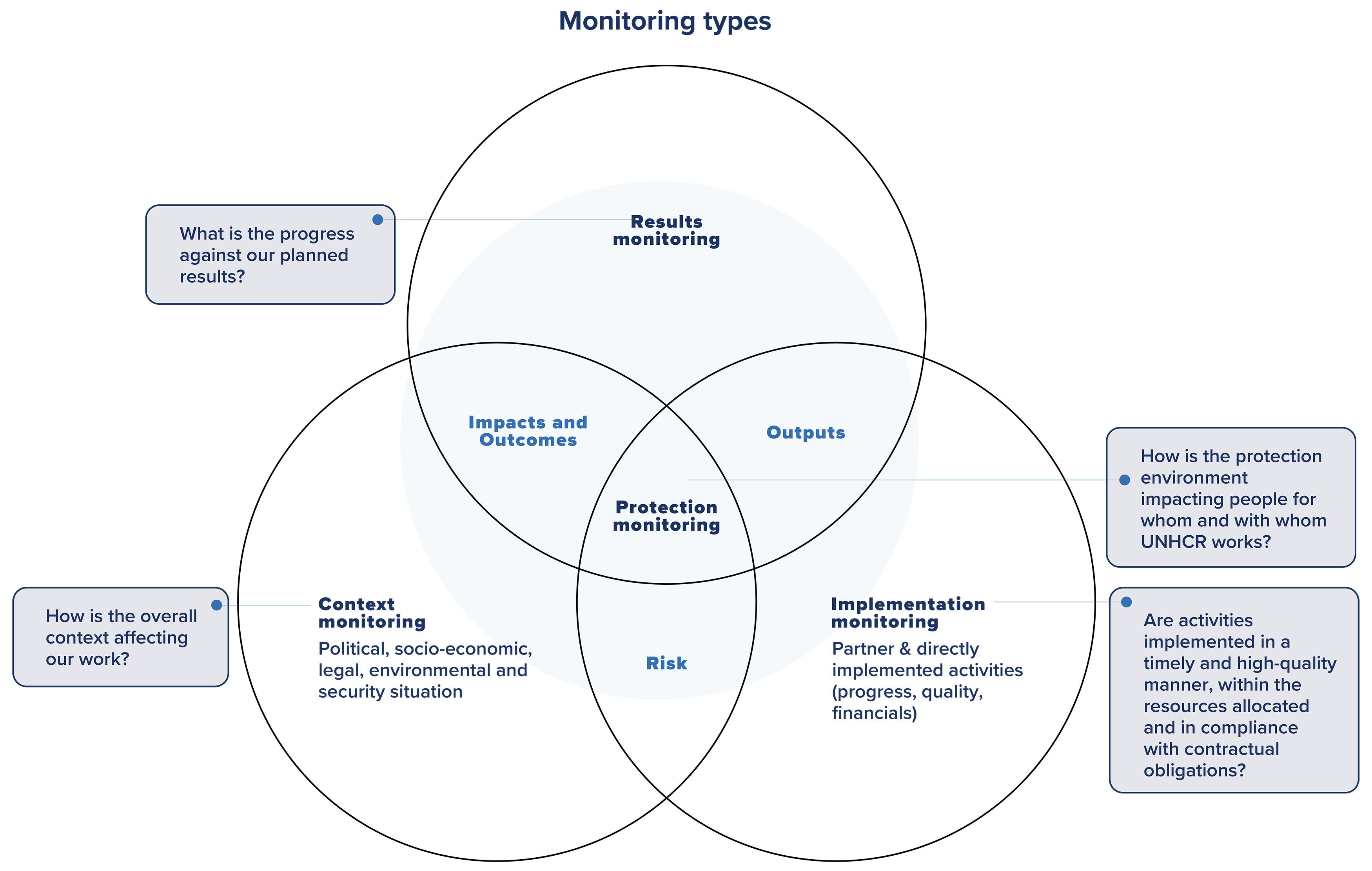 UNHCR distinguishes between four types of monitoring: results monitoring, implementation monitoring, protection monitoring and context monitoring.