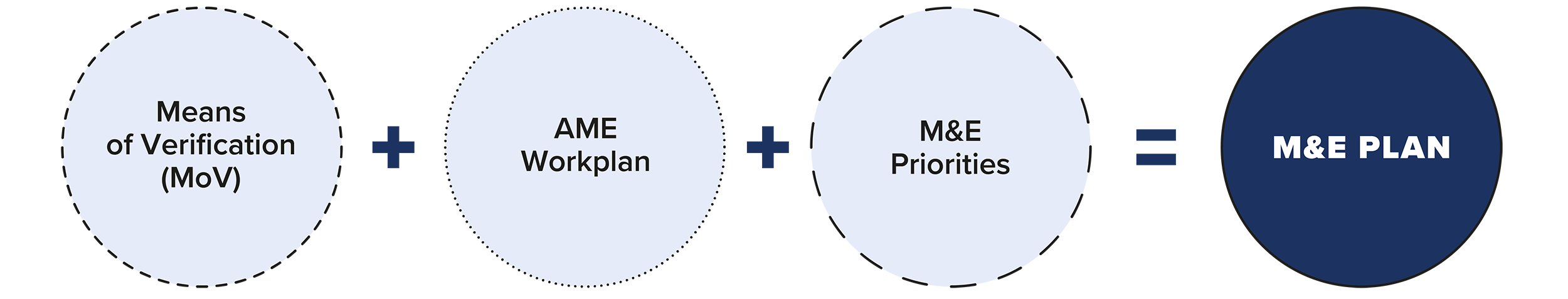 - The M&E plan consists of three components: means of verification (MoV) for results indicators, the assessment, monitoring and evaluation (AME) workplan, and M&E priorities.