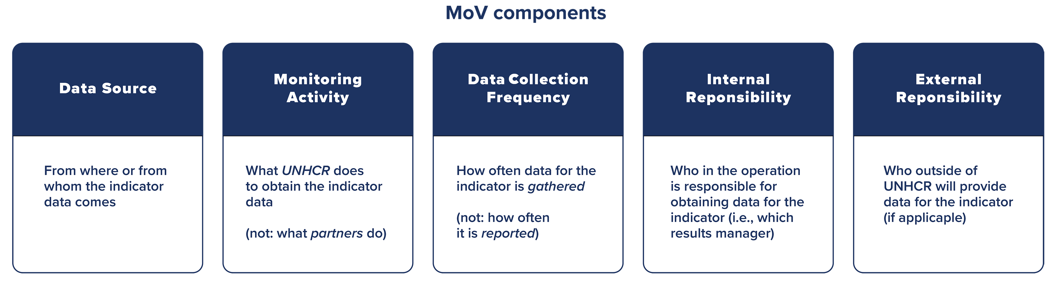 The planned MoV outline how operations obtain data for each results indicator. Defining MoV for an indicator involves deciding on the data source, monitoring activity, data collection frequency, and internal and external responsibility.