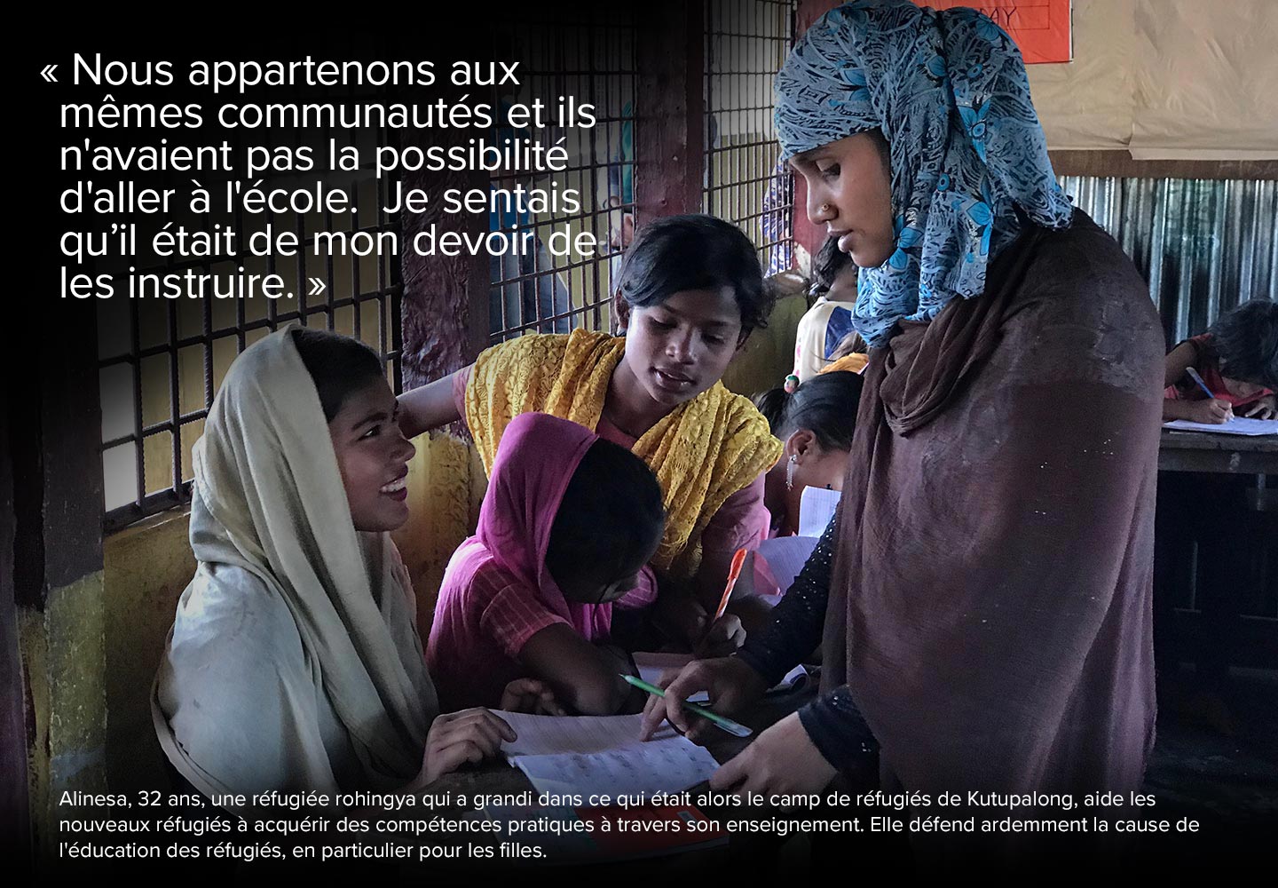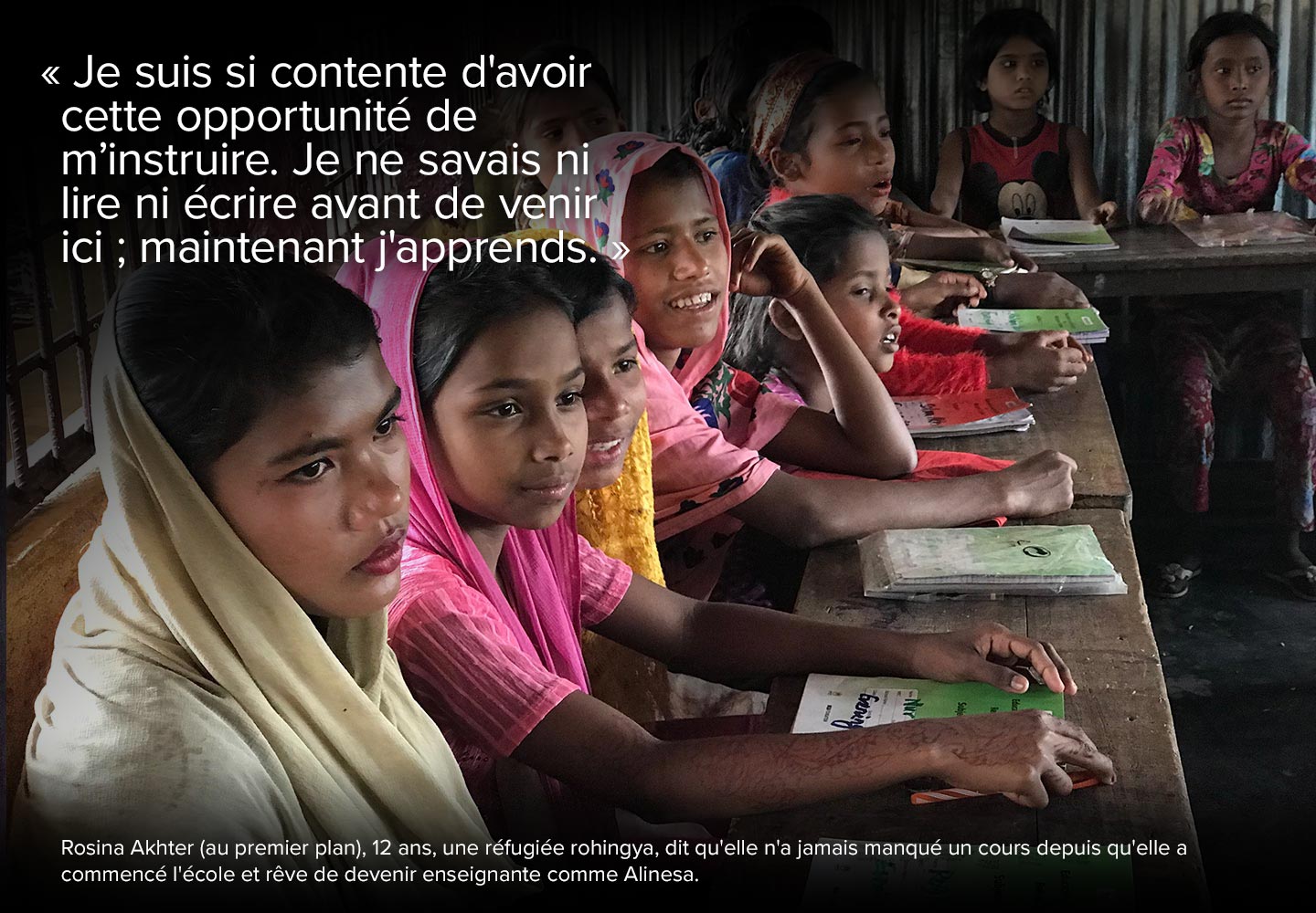 Il est temps d’accorder la priorité à l'éducation des jeunes réfugiéesNur Kalima, 11 ans, réfugiée rohingya scolarisée dans une école financée par le HCR à Kutupalong, Bangladesh. Il est difficile pour les jeunes filles rohingyas d’aller au bout de leur scolarité en raison des pressions sociales, des mariages précoces et de l’impossibilité d’accéder à l’enseignement supérieur. © HCR/Roger Arnold