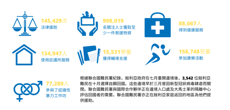 聯合國難民署(敍利亞)在 2020 年一月到十月期間,為 864,696 名流離失所者、回國者及收容社區的成員提供社區為本的保護
