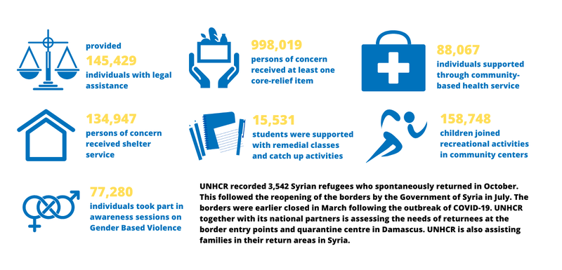 Between January and October 2020, UNHCR Syria provided community-based protection to 864,696 displaced persons, returnees and host community members.