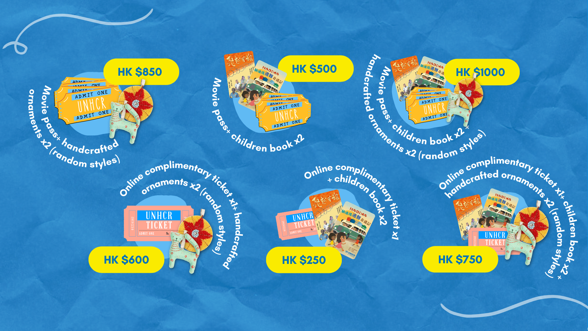 - A donation of HK$1,000 for a Movie Pass, 2 children books and 2 handcrafted ornaments by refugees (random styles)