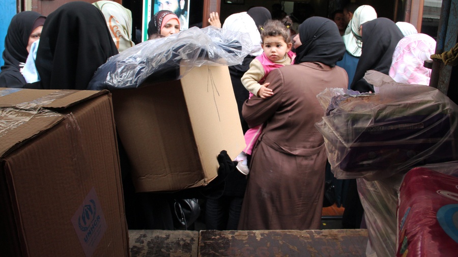 Syrian refugees queue up for UNHCR relief items in Tripoli, northern Lebanon.