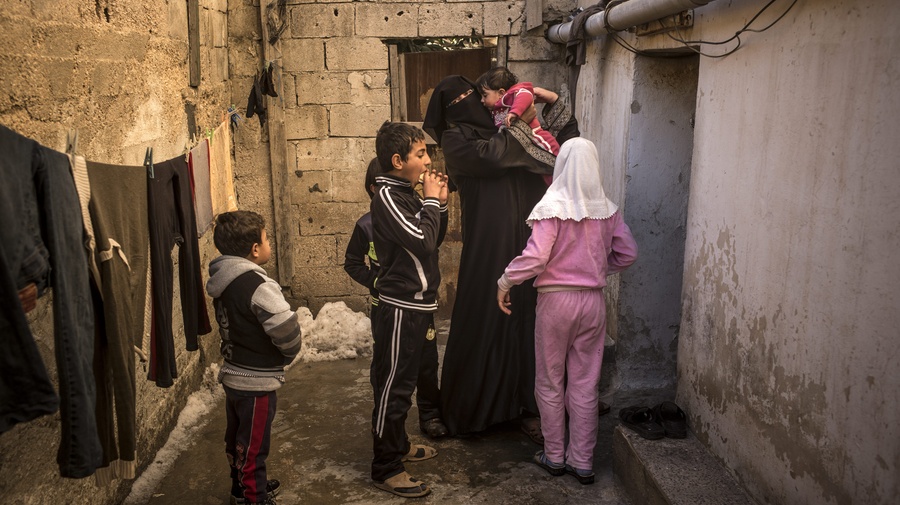 A Syrian mother and her children arrive at the dilapidated basement building where they are staying in the Jordan capital, Amman.