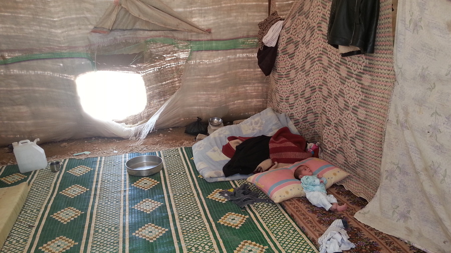 A baby gets some rest in one of the tents put up in Hasiya for the displaced Syrian families. Children there face many health problems.