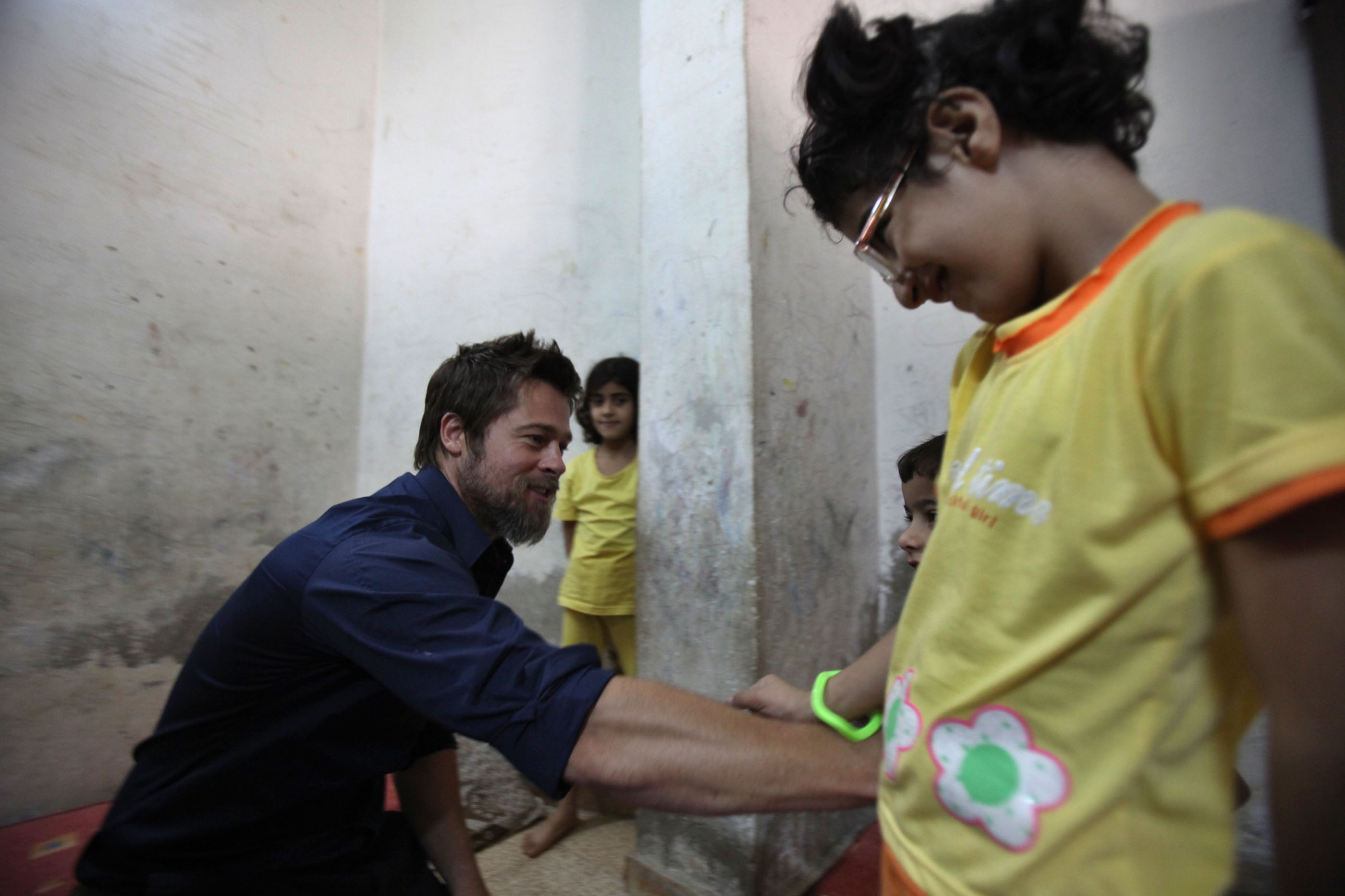 American actor Brad Pitt, partner of UNHCR Goodwill Ambassador Angelina Jolie, plays with refugee children in Damascus today.