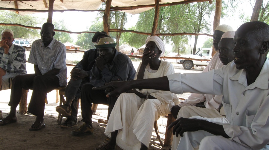 Locals and refugees discuss livestock grazing at a meeting facilitated by UNHCR in Maban County.