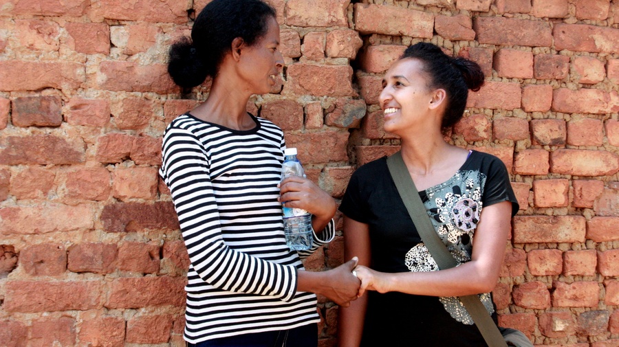 Eritrean refugee Lyia Hiele (in striped shirt), and Eritrean asylum seeker Yordanos Heyabu exchange mutual thanks for the support they provide to each other on their way to Kampala's police station, where Yordanos needs to register her presence in the country. The two women are bound by a common story of exile.
