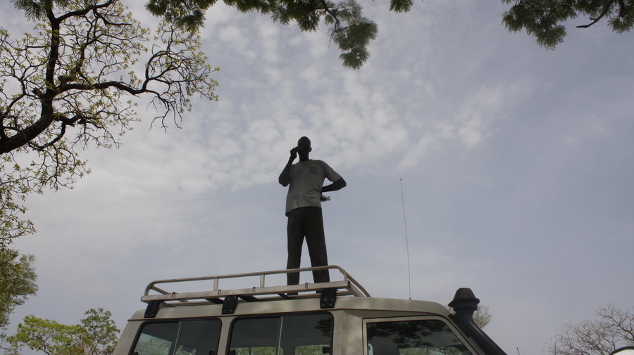 A UNHCR staffer struggles to get a mobile signal in the remote border area of Yida. UNHCR/V.Tan