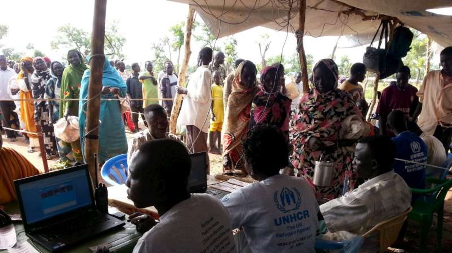 UNHCR staff at the Yida camp in South Sudan work on the monthly distribution of food rations for refugees. A new toll has cut the time it takes to complete the process from 10 days to four.© UNHCR/S.Cansizoglu