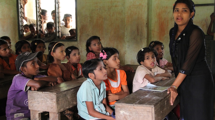 Rozeya teaches a classroom of students at a middle school in Myanmar's Rakhine state. The 21-year-old battled her conservative society, poverty and sceptical teachers to get an education.