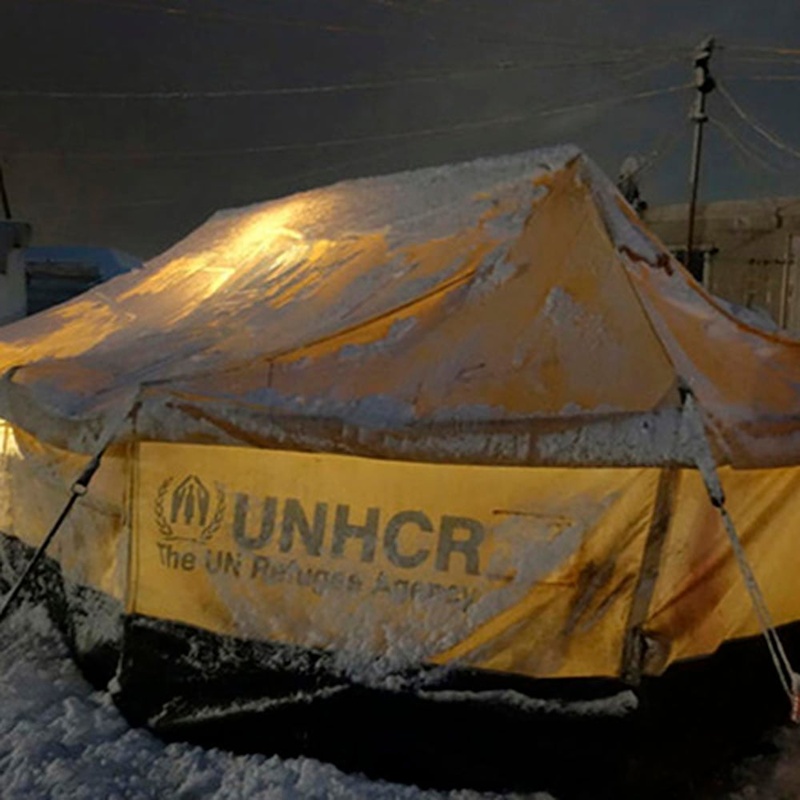 A UNHCR family tent is built to be weatherproof in both hot and cold weather conditions, and will last for a year, with room for five to sleep and to live, so that they can be kept safe and away from snow.